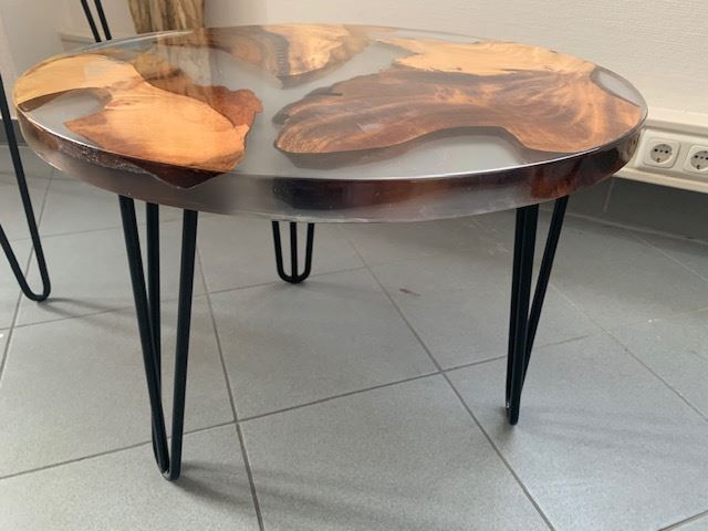Beistelltisch aus Harz und Nußbaumholz incl. Haarnadelgestell aus Metall schwarz