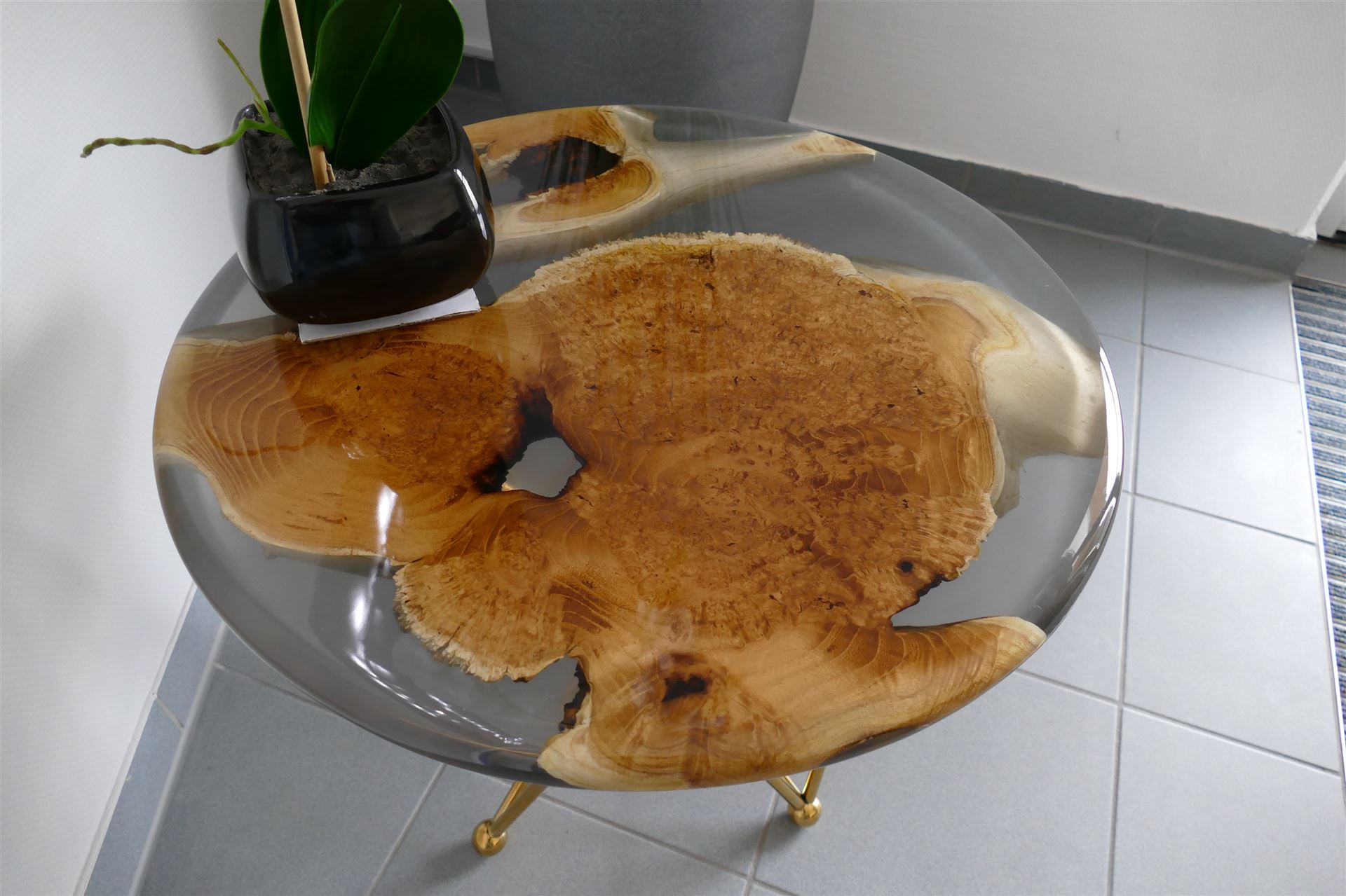 Exklusiver Beistelltisch aus Harz und Wurzelholz mit einem außergewöhnlichen Gestell aus Edelstahl in Goldfarben.
