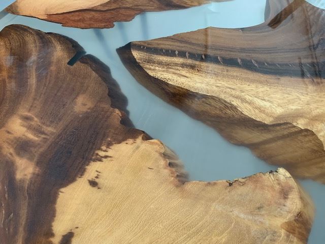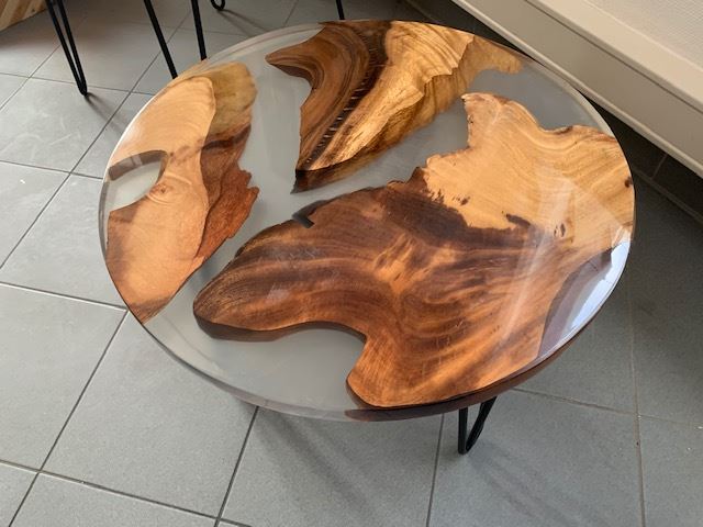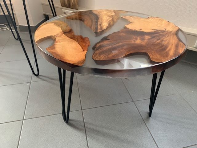 Beistelltisch aus Harz und Nußbaumholz incl. Haarnadelgestell aus Metall schwarz