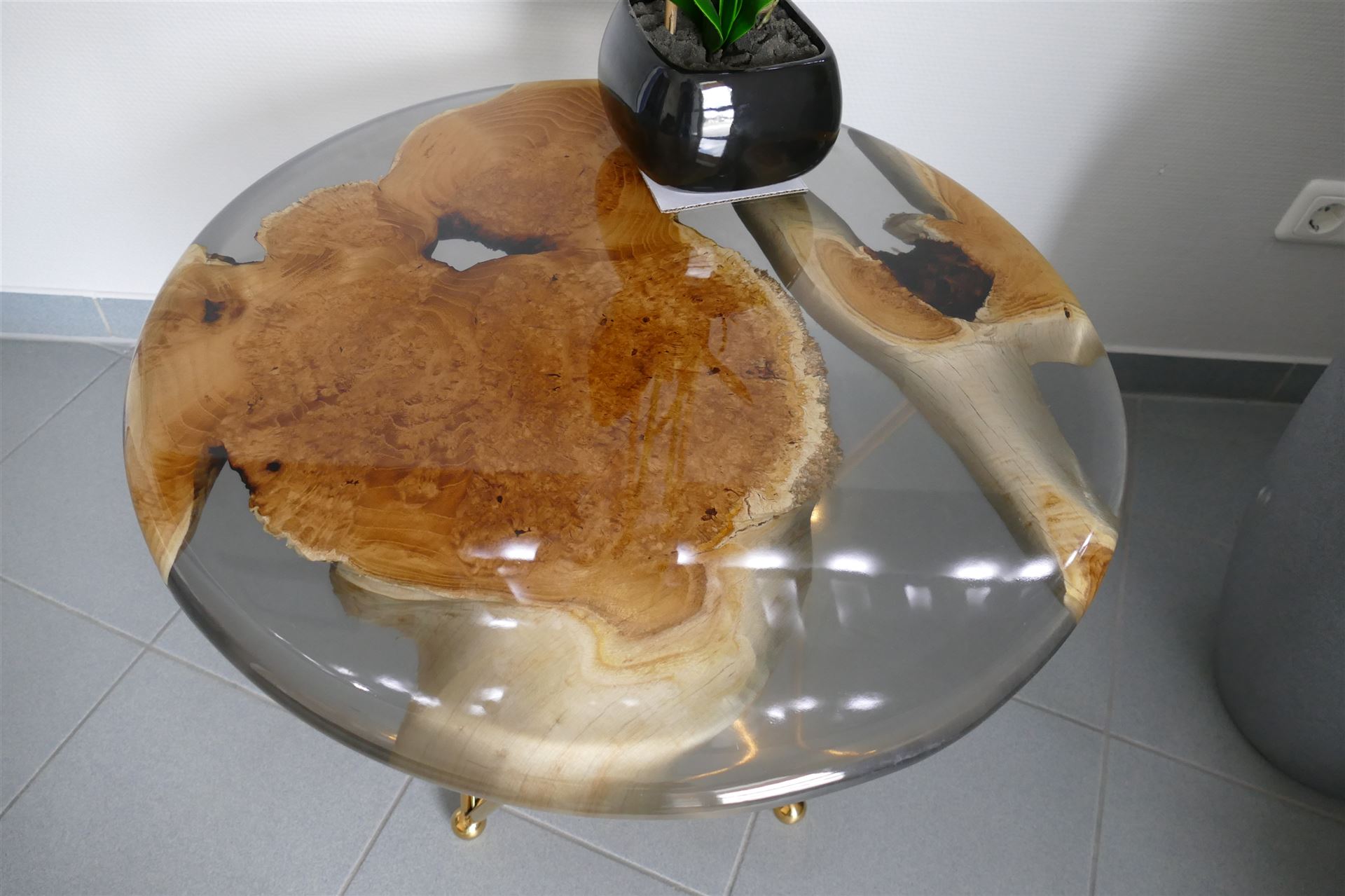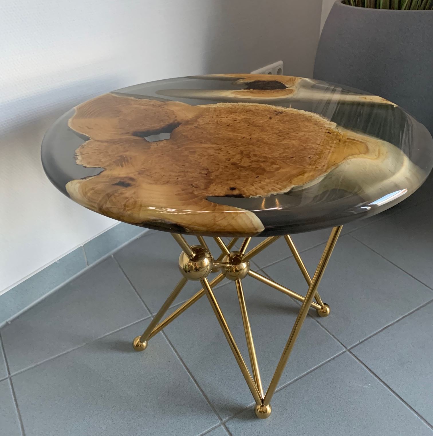 Exklusiver Beistelltisch aus Harz und Wurzelholz mit einem außergewöhnlichen Gestell aus Edelstahl in Goldfarben.