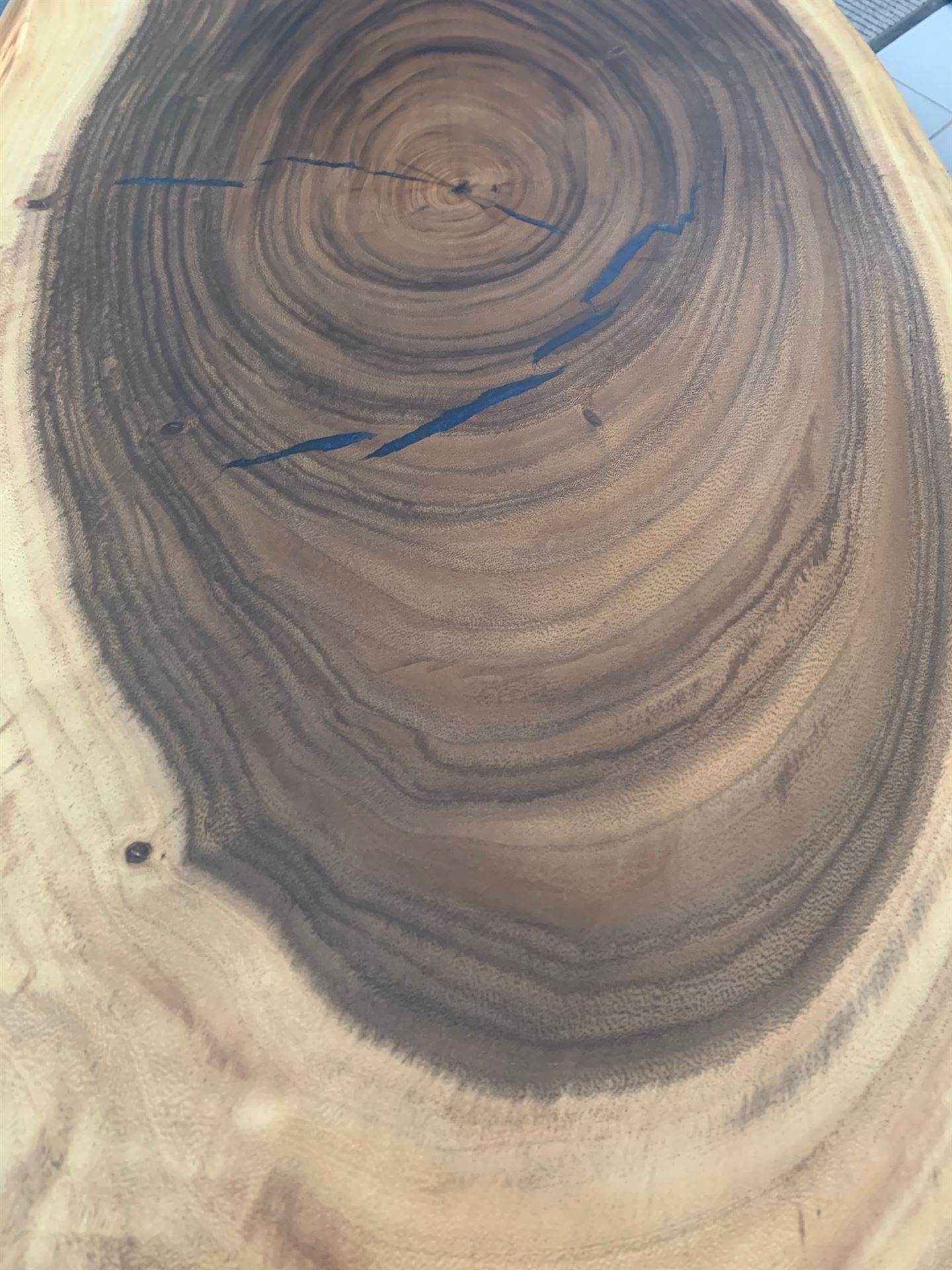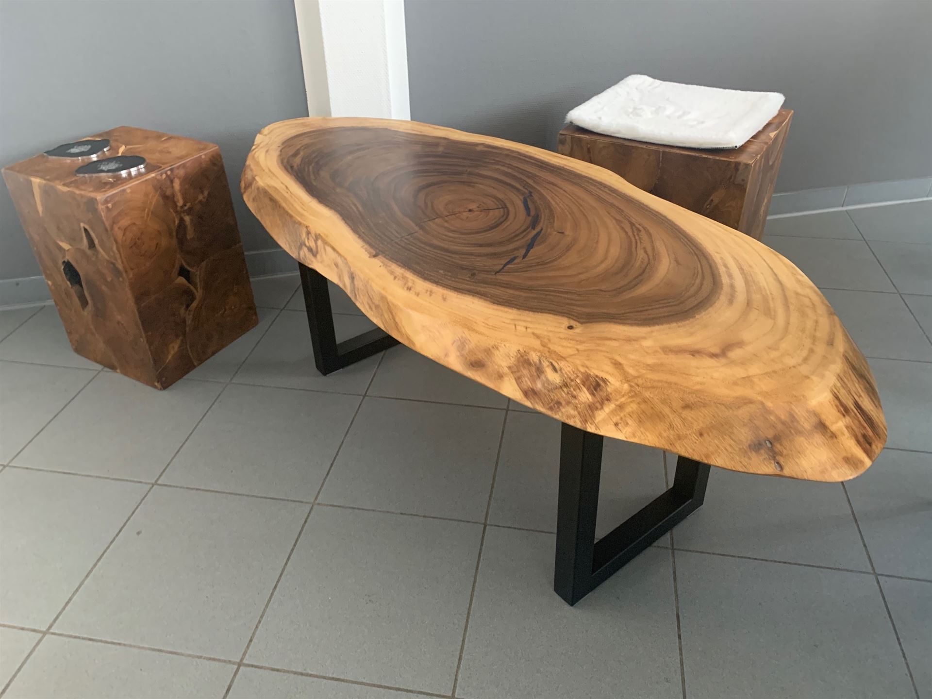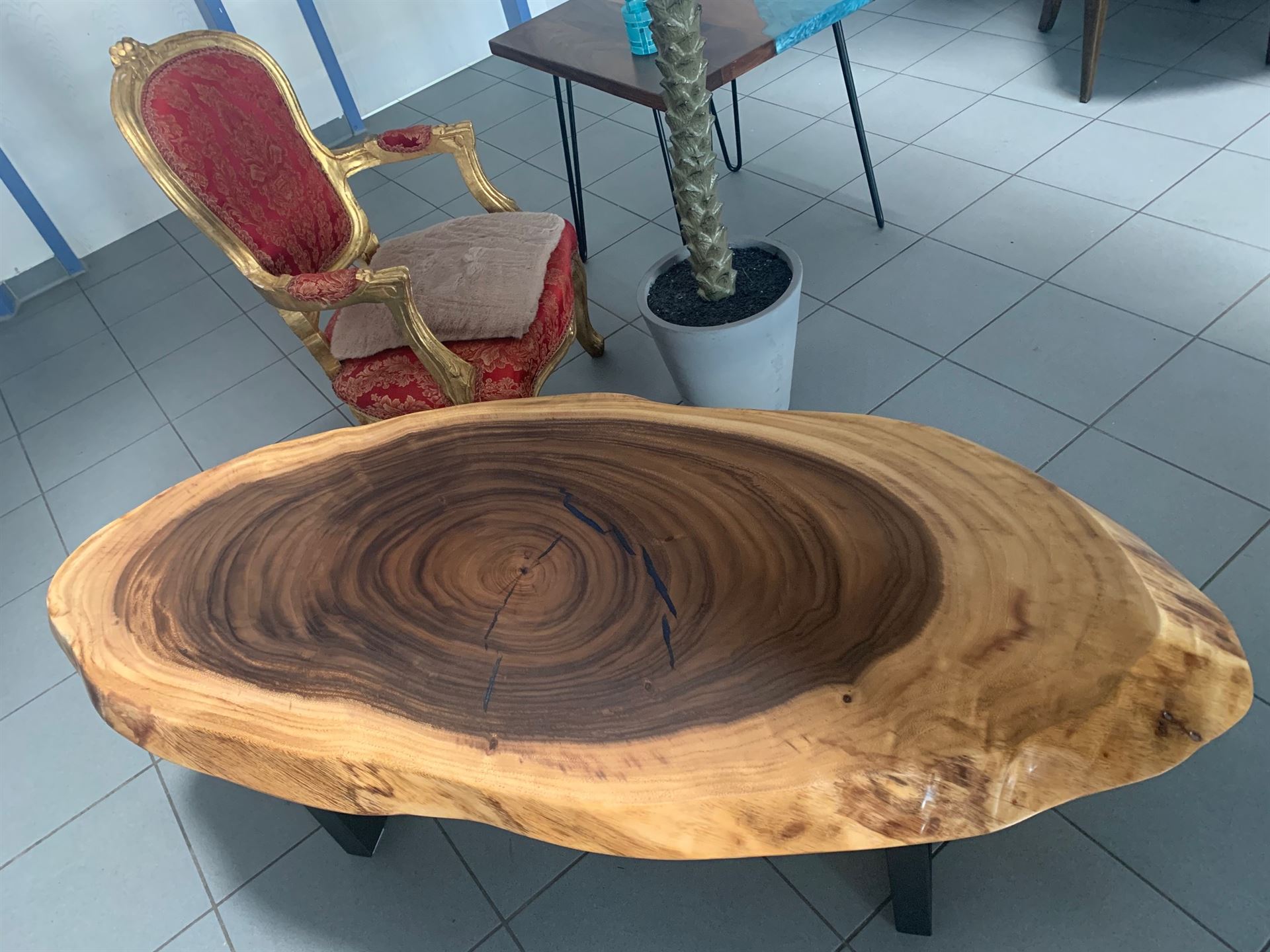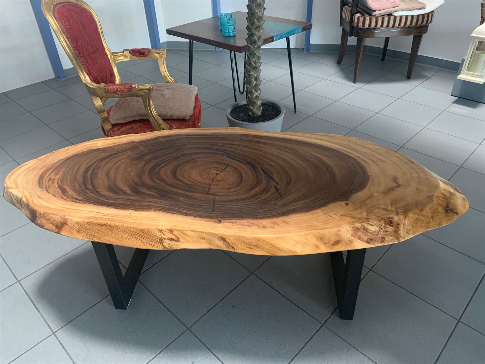 Der natürliche Nußbaum mit edler Livekante und Rißfüllung mit Harz als Eyecatcher in Ihrer Wohnung…..
